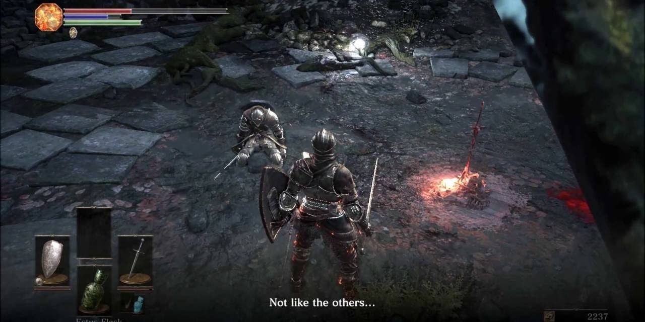 When you kickoff see Anri they're being accompanied by a silent companion named Horace the Hushed, and together they're looking for Aldrich. It'south articulate from the dialogue that Anri and Horace accept a shared past that deeply affected them and they vowed to always take each other's back.